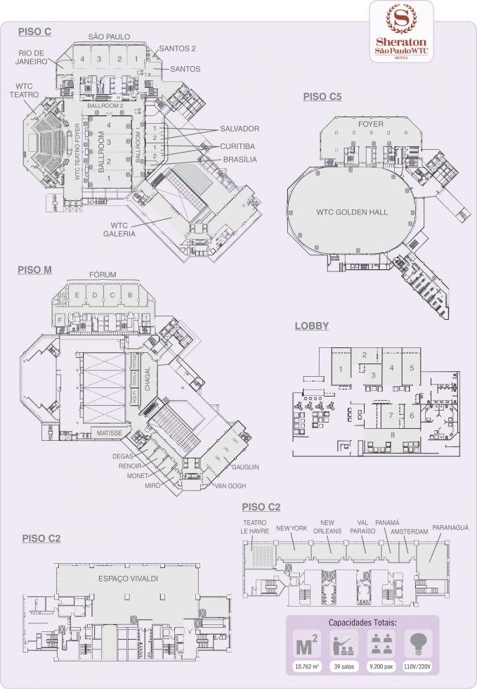com 1,2 m2 pode ser dividido em em quatro salas, com amplos Foyers e ainda, Teatro com poltronas flexíveis para 526 lugares. O Golden Hall, espaço multifuncional, com mais de 3 mil m2 de área livre e pé direito de 15 metros acomoda até 2,5 mil pax. Versatilidade para montagem de eventos esportivos, plenárias, exposições, sociais, shows, entre outros.